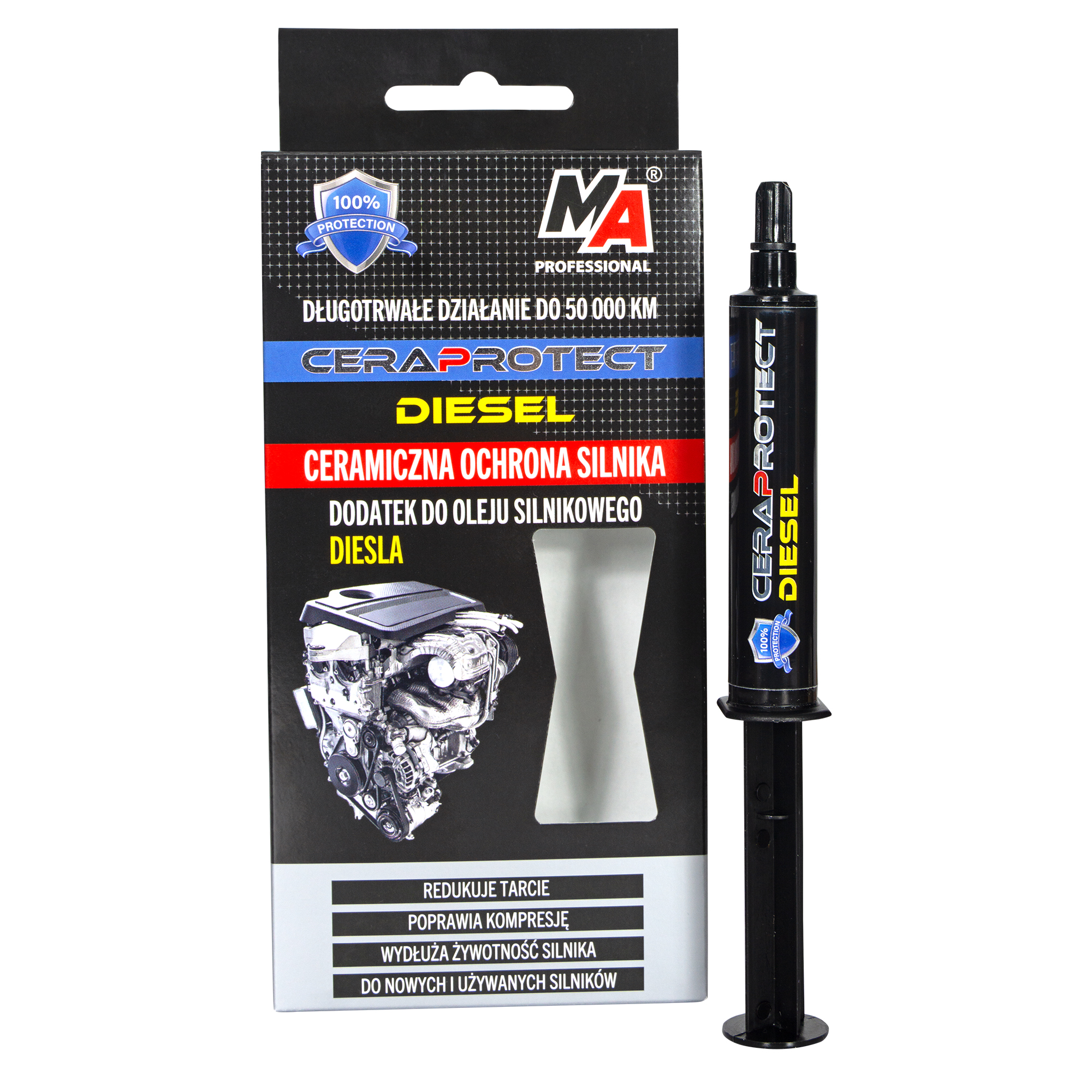 MA Professional CERAPROTECT Diesel to innowacyjny preparat opracowany w oparciu o zaawansowaną technologię ceramiczną, przeznaczony do silników wysokoprężnych. Zawiera mikrocząsteczki ceramiki oraz nowoczesne środki przeciwzużyciowe, zawieszone w wysokiej jakości olejach bazowych.