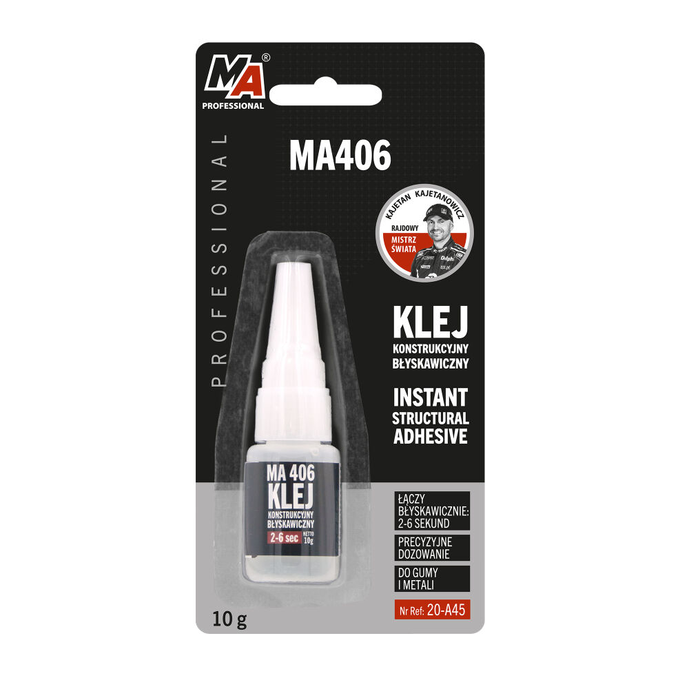 MA 406 Professional to błyskawiczny cyjanoakrylowy klej konstrukcyjny o niskiej lepkości do łączenia wielu tworzyw sztucznych i gumy. Skleja w kilka sekund. Szczególnie polecany jest do połączeń trudno sklejalnych. Temperatura pracy od -50 do 100ºC. Pełne utwardzenie po 24 godzinach.