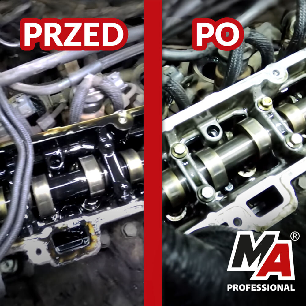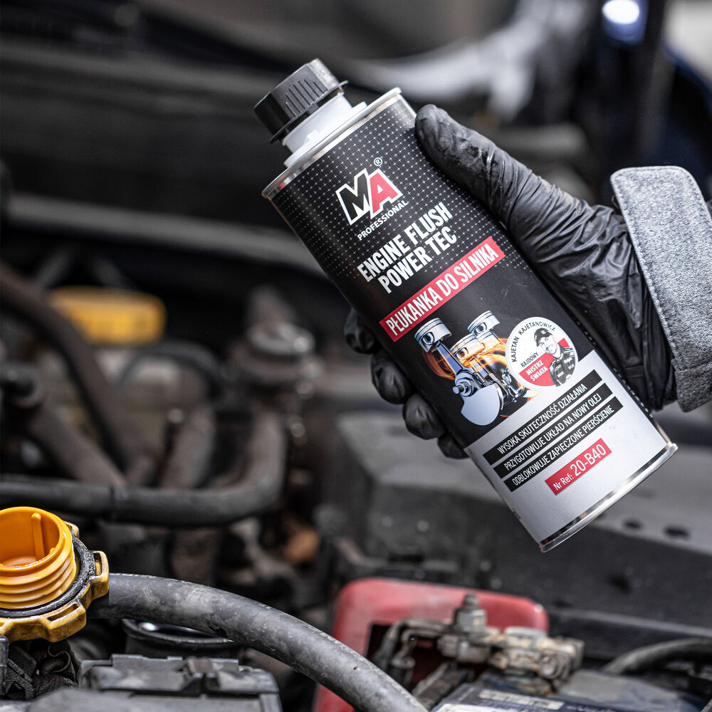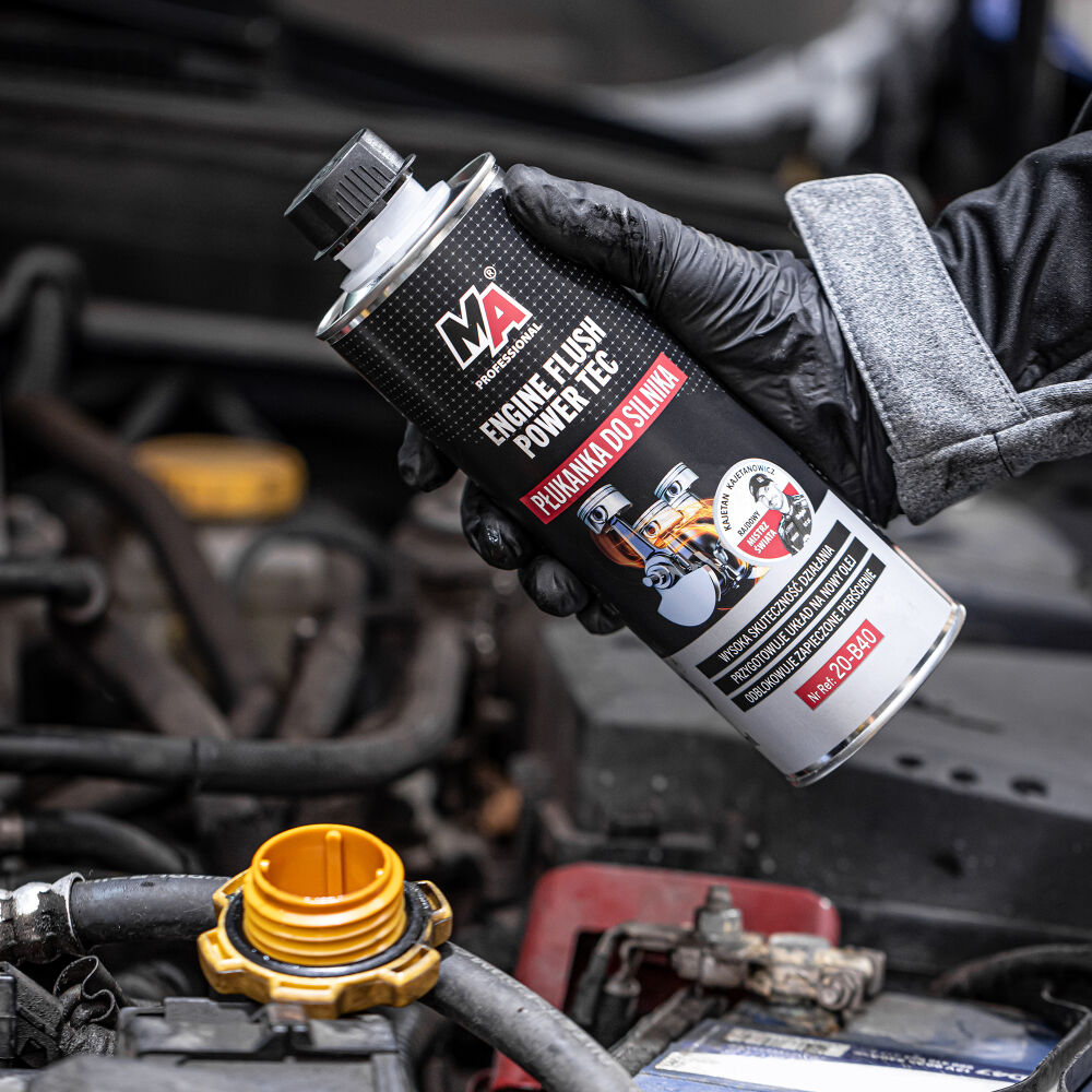 Profesjonalny preparat do płukania układu olejowego silników spalinowych oparty na wysokowydajnych rozpuszczalnikach, detergentach oraz środkach smarnych. Dzięki zastosowaniu specjalnej formulacji preparat skutecznie rozpuszcza twarde nagary, osady i inne trudne do usunięcia zabrudzenia znajdujące się w układzie smarowania silnika. Przygotowuje układ olejowy na nowy olej. W przypadku problemów z kompresją wynikających z zapieczenia i zablokowania pierścieni tłokowych preparat (po wymontowaniu świec) można zaaplikować bezpośrednio do komory spalania i pozostawić na klika godzin w celu penetracji i rozpuszczenia nagarów. W wyniku uwolnienia zapieczonych pierścieni silnik zwiększy kompresję w cylindrach i znacznie poprawi się jego dynamika oraz moc. Produkt przywraca pełną przepustowość kanałom olejowym. Znacznie ogranicza konsumpcje oleju oraz dymienie z układu wydechowego, redukuje szkodliwą emisję spalin. Środek stosuje się do wszystkich rodzajów silników spalinowych. Opakowanie o pojemności 500ml jest wystarczające do wypłukania silnika z układem olejowym o pojemności 6 litrów. W przypadku mniejszego układu można bez obaw wlać całą zawartość puszki. Preparat należy stosować prewencyjnie przy każdej wymianie oleju w silniku oraz naprawczo w przypadku nadmiernego spalania oleju lub problemów z kompresją. Operacja jest całkowicie bezpieczna dla silnika.